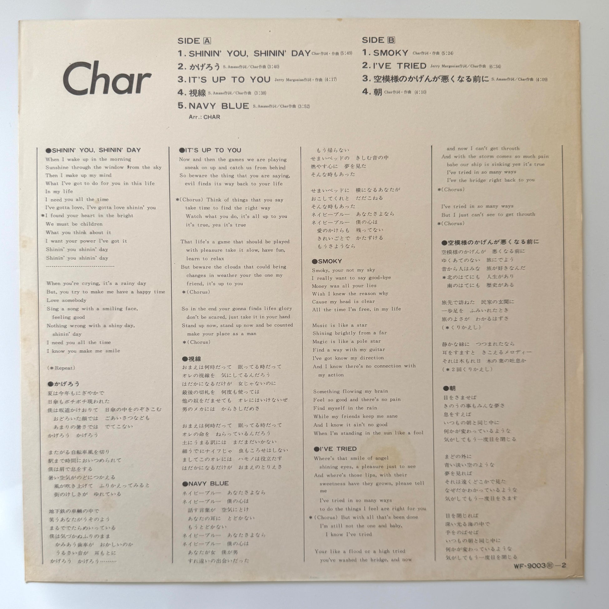 The first album by Char, one of Japan’s finest guitarists. It includes the popular breezy, groovy city-pop track ‘Shinin’ You, Shinin’ Day’ and the excellent jazz-rock tune ‘Smoky,’ among others.