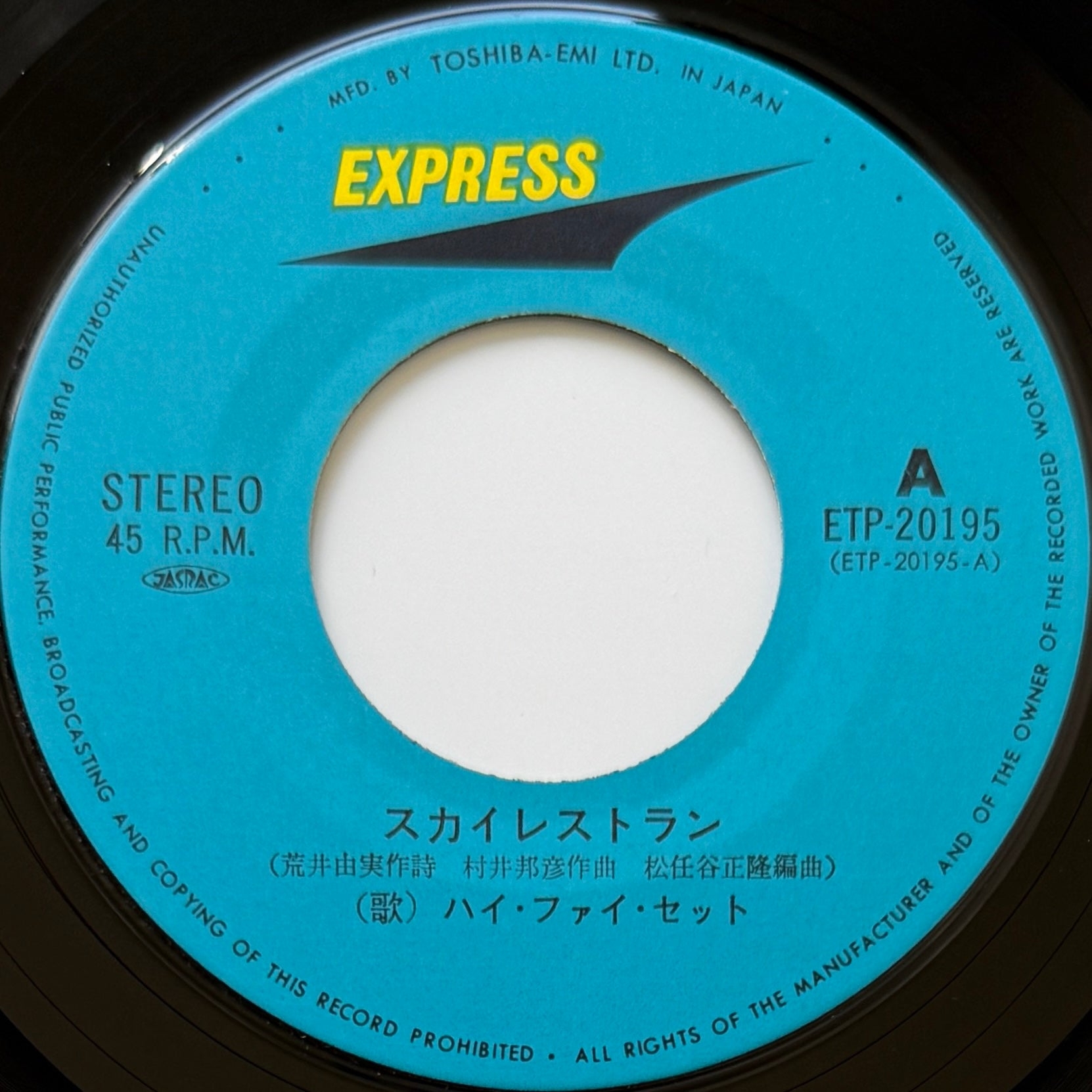 Features the iconic city pop track 「Sky Restaurant」, with the B-side 「土曜の夜は羽田に来るの」 — a mellow and melancholic city pop gem. A true double-sider.