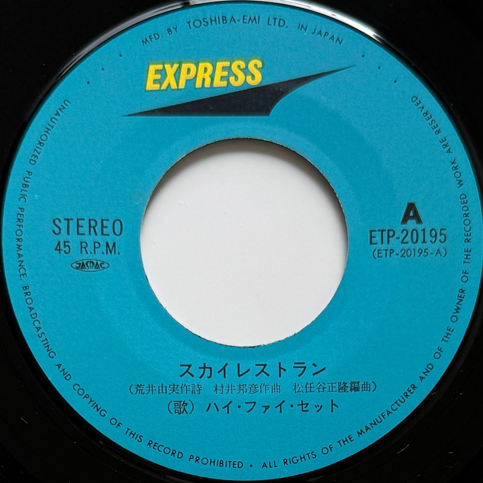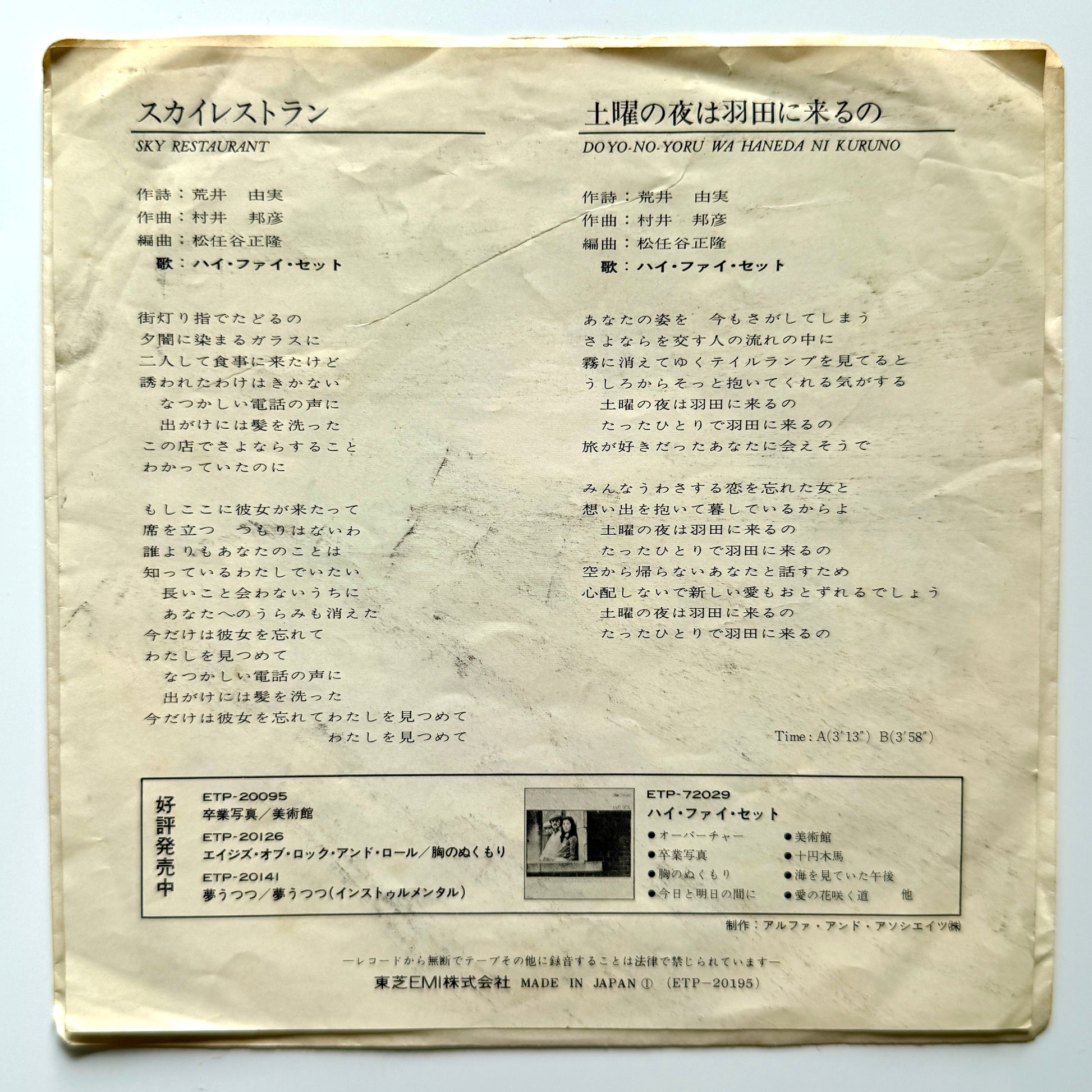 Features the iconic city pop track 「Sky Restaurant」, with the B-side 「土曜の夜は羽田に来るの」 — a mellow and melancholic city pop gem. A true double-sider.