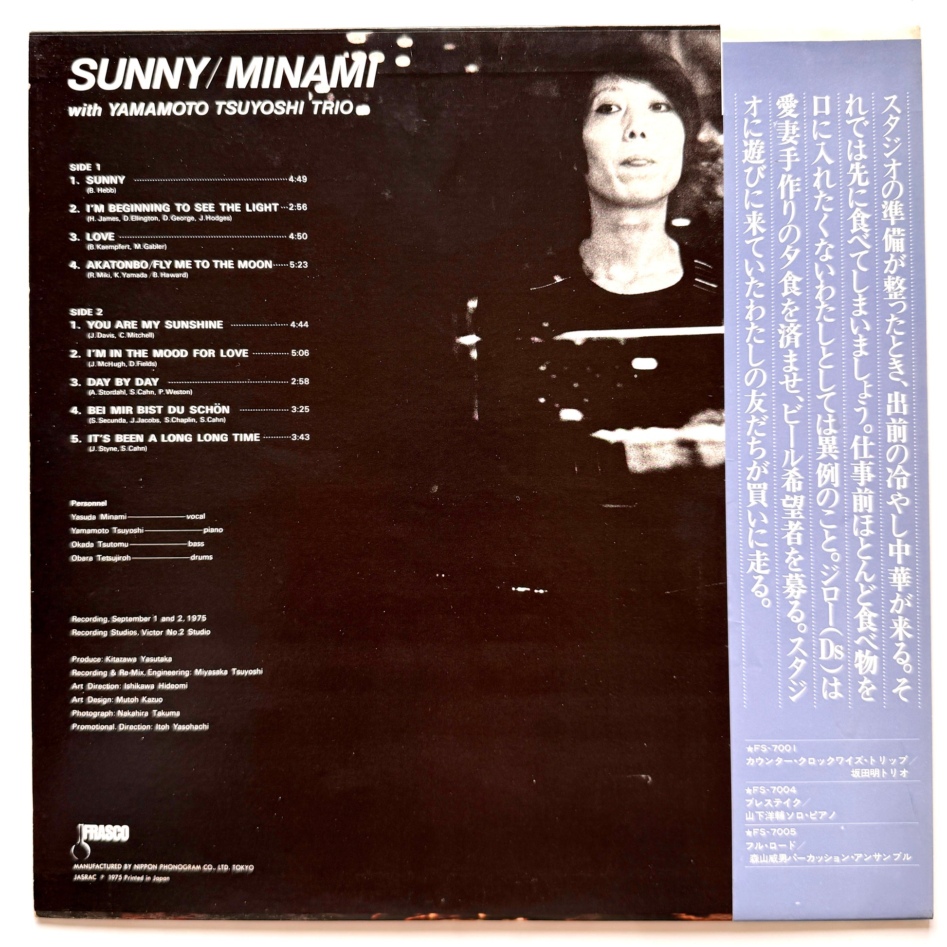 An album by singer Minami Yasuda—known as the “Queen of the Underground”—recording standard jazz backed by the Tsuyoshi Yamamoto Trio. Includes the jazz arrangement of the Japanese children’s song 「Akatonbo」, the groovy bass-driven 「Bei Mir Bist Du Schon」, and 「Love」, highlighted by Tsuyoshi Yamamoto’s exuberant, bouncing piano performance. First pressing on the Frasco label.
