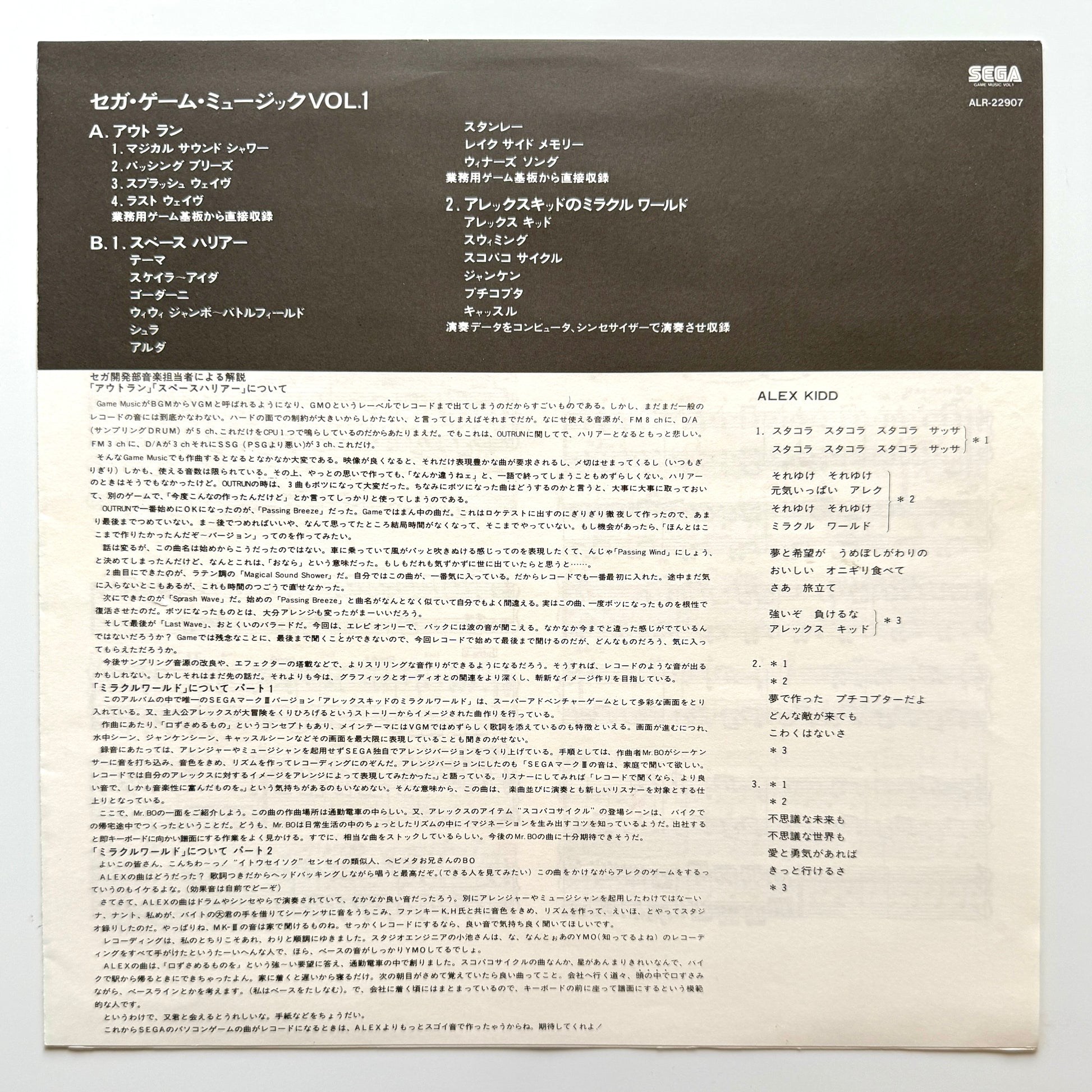 The soundtrack for three classic Sega games: "Out Run," "Space Harrier," and "Alex Kidd in Miracle World." A revolutionary collection of 80s video game music—an absolute treasure for enthusiasts of the genre. Just looking at the jacket will get some people hyped. Featuring electrified funk at its finest, with impeccably crisp drum machine programming or sampled rhythms intertwined with lush electronic melodies. Simply outstanding.