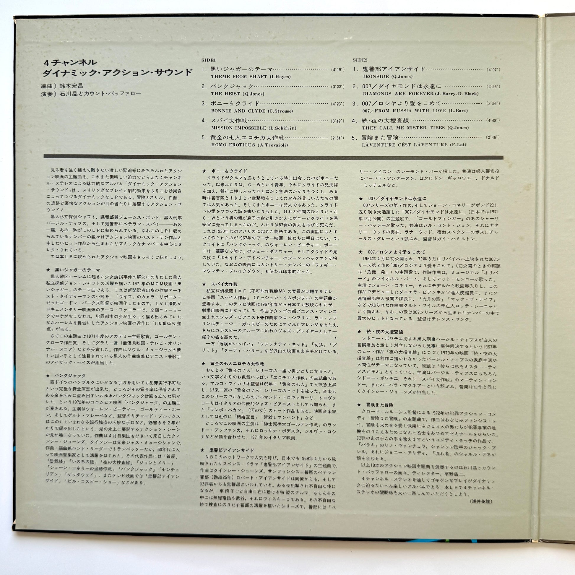 A rare groove album of soundtrack covers released under the name Akira Ishikawa & Count Buffaloes, arranged by Hiromasa Suzuki. Includes rare groove classics such as Isaac Hayes’ “Theme From Shaft,” Quincy Jones’ “The Heist” with its heavy, effects-laden drum break, the popular track “Ironside,” and the hard-hitting funk of “They Call Me Mister Tibbs.” A promo copy that’s not often seen.