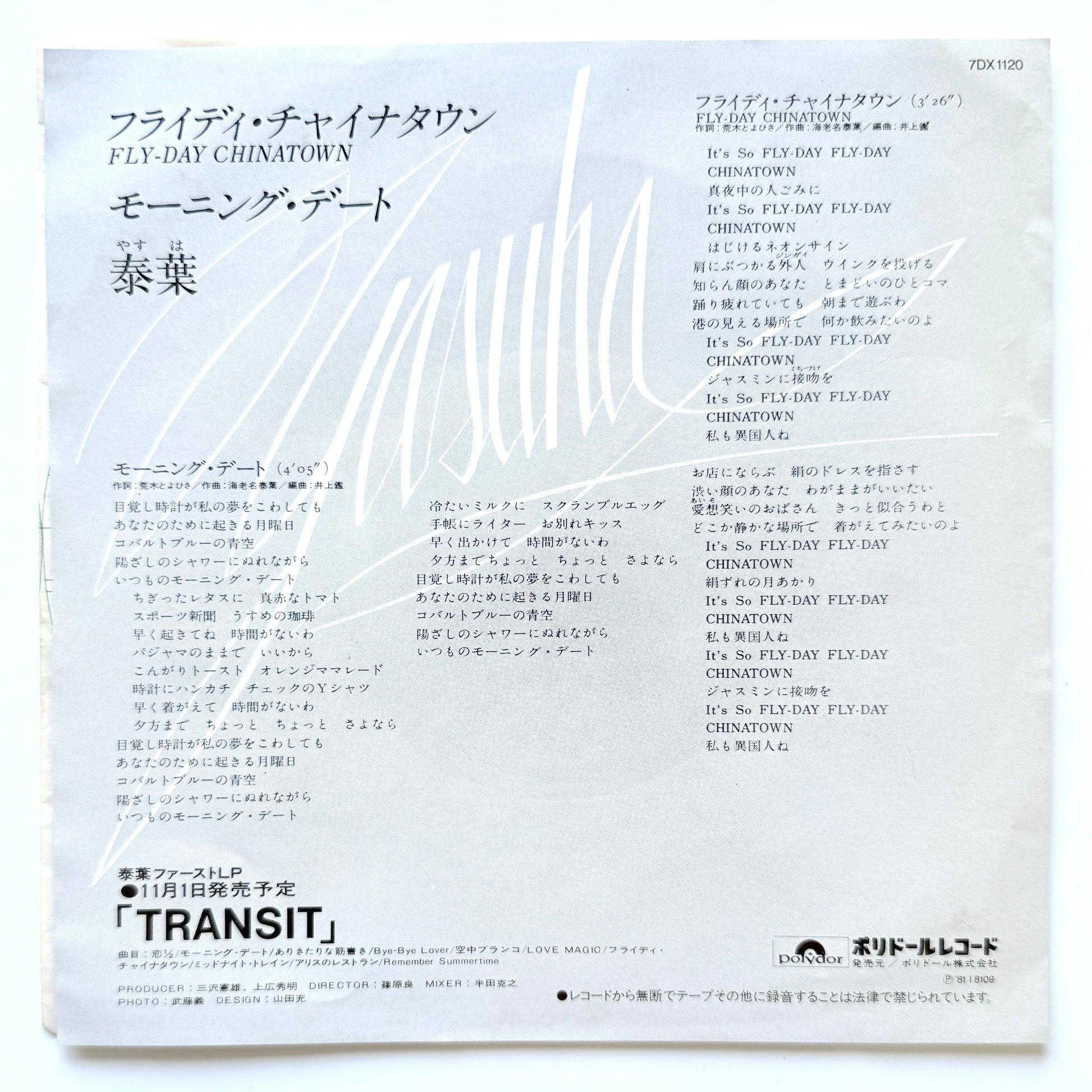7-inch single of the iconic City Pop masterpiece “Fly-Day Chinatown,” with outstanding recording quality.